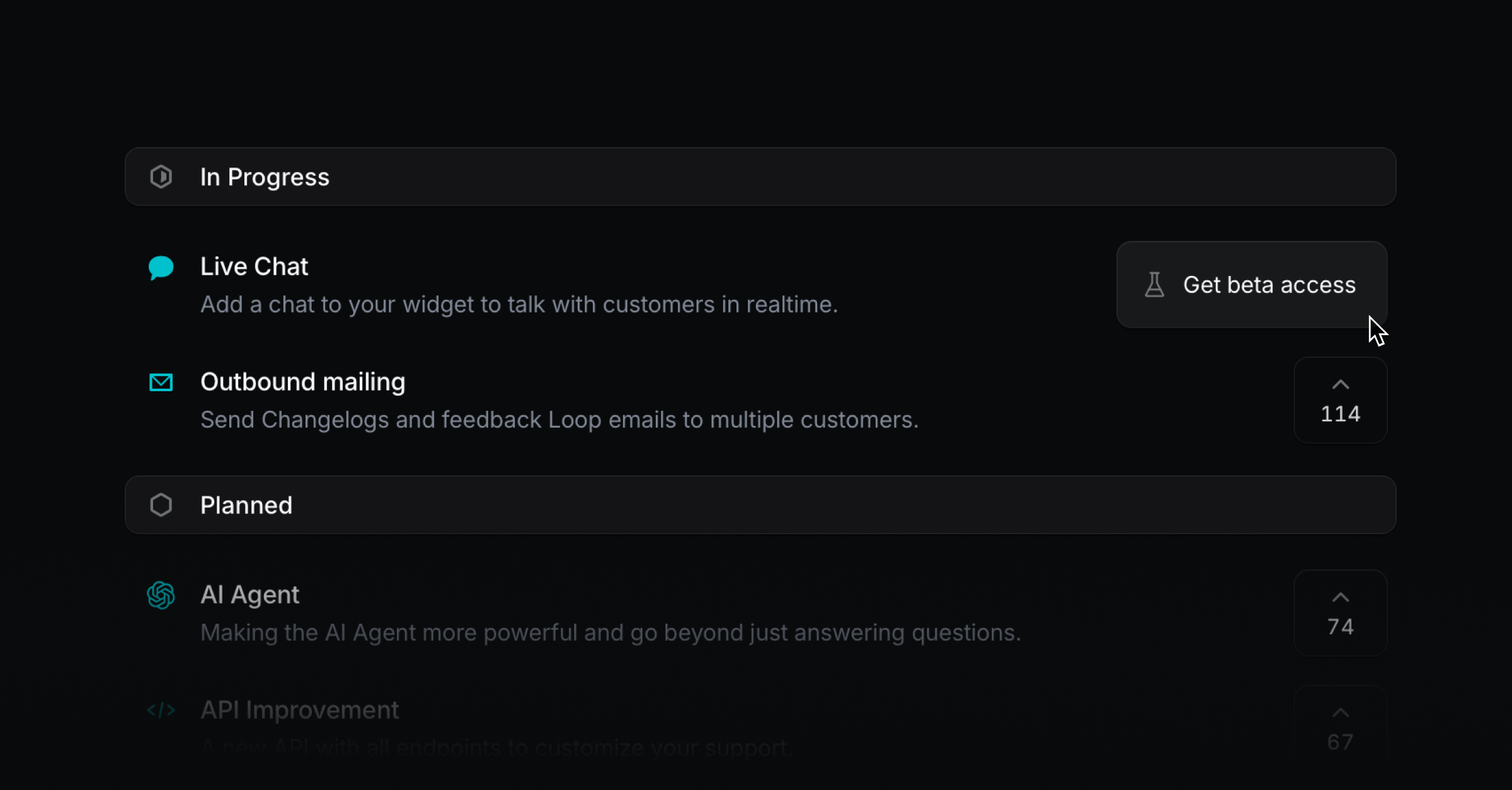 You can now turn the upvote button on your feedback portal into a “Get beta access” button so customers can request access easily. Clicking it creates a message from that user that you can answer manually or automate via the API. Just open a Linear project in Productlane and press the “Beta” switch to make that button appear.