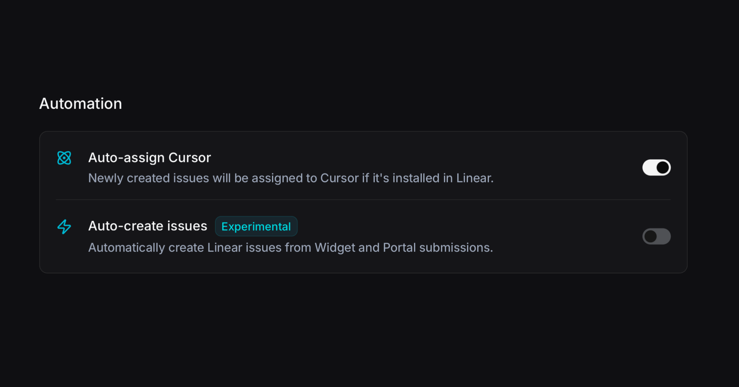 Go to Settings → Linear and turn on Auto-assign Cursor. You can go one step further and activate that every message from the portal and widget auto-creates a Linear issue. We recommend this only for smaller teams with lower support volume.