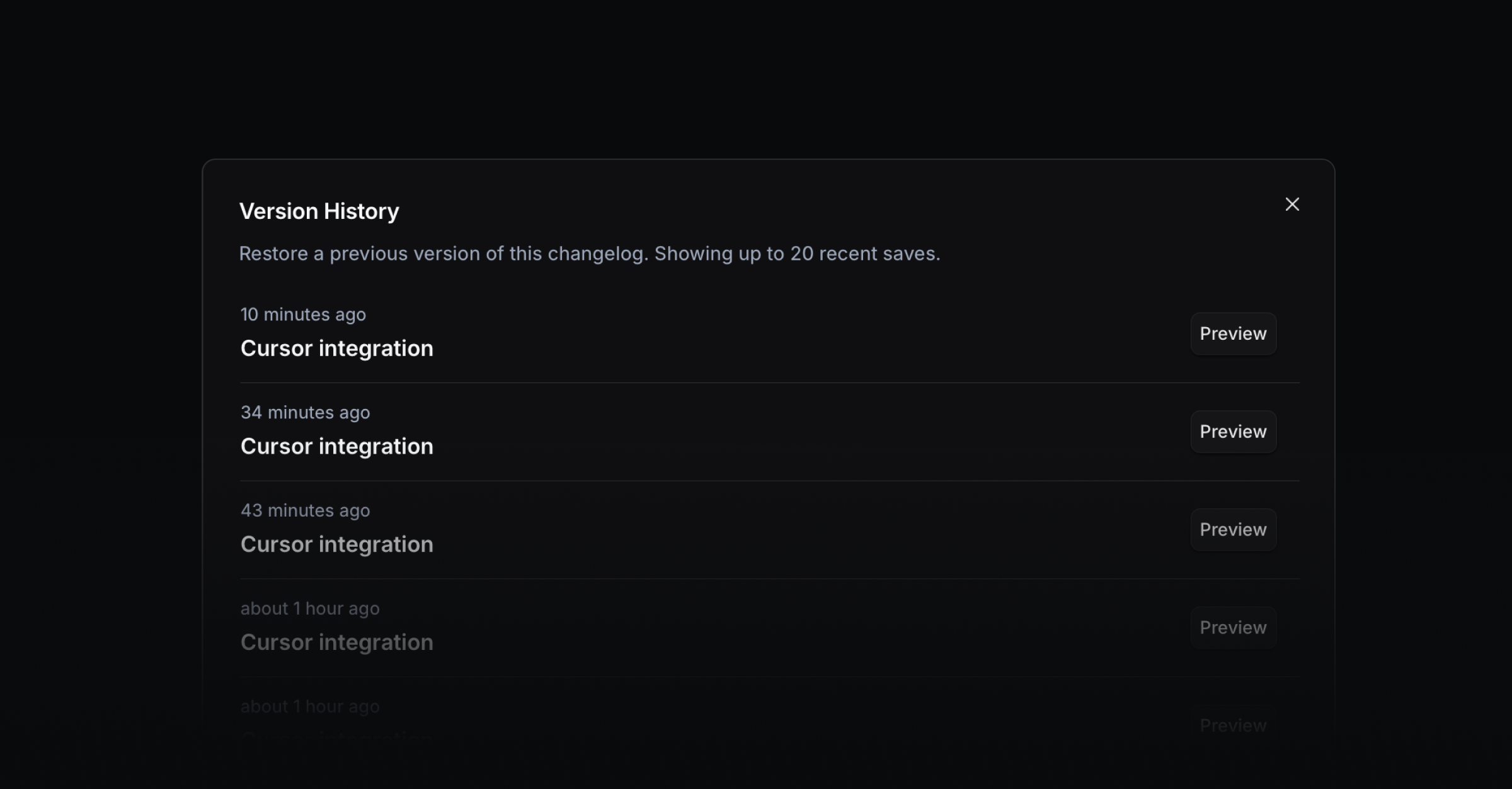 Recover earlier drafts of Changelog or help center entries with version history. Just use the three-dot menu in the top right to view auto-saved versions and restore one.